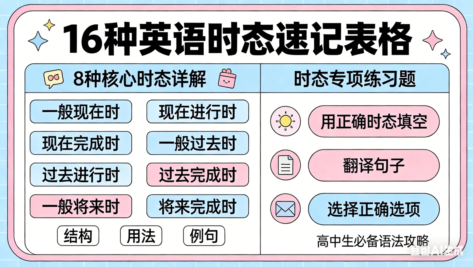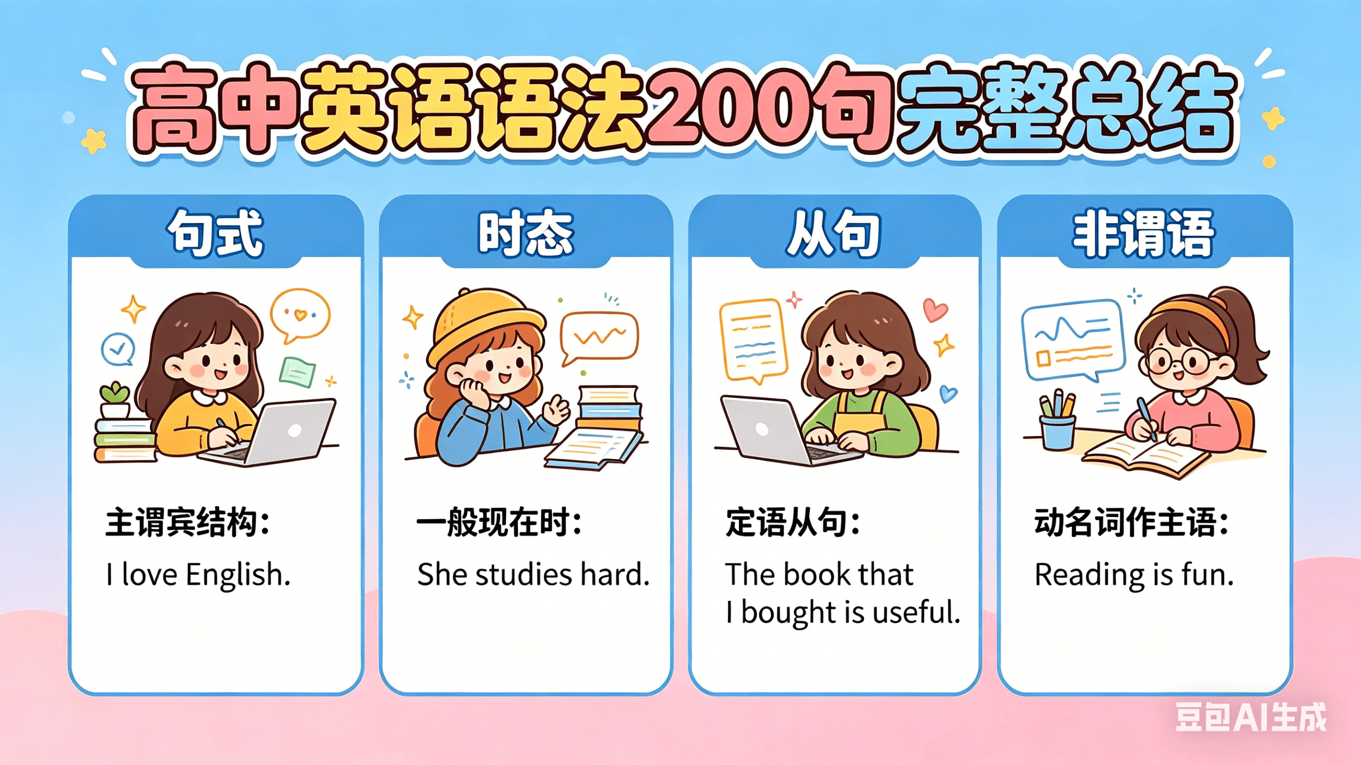200 个经典例句覆盖高中英语全部语法点!包含句式、时态、从句、非谓语动词等 20 大核心专题,高考语法必备。